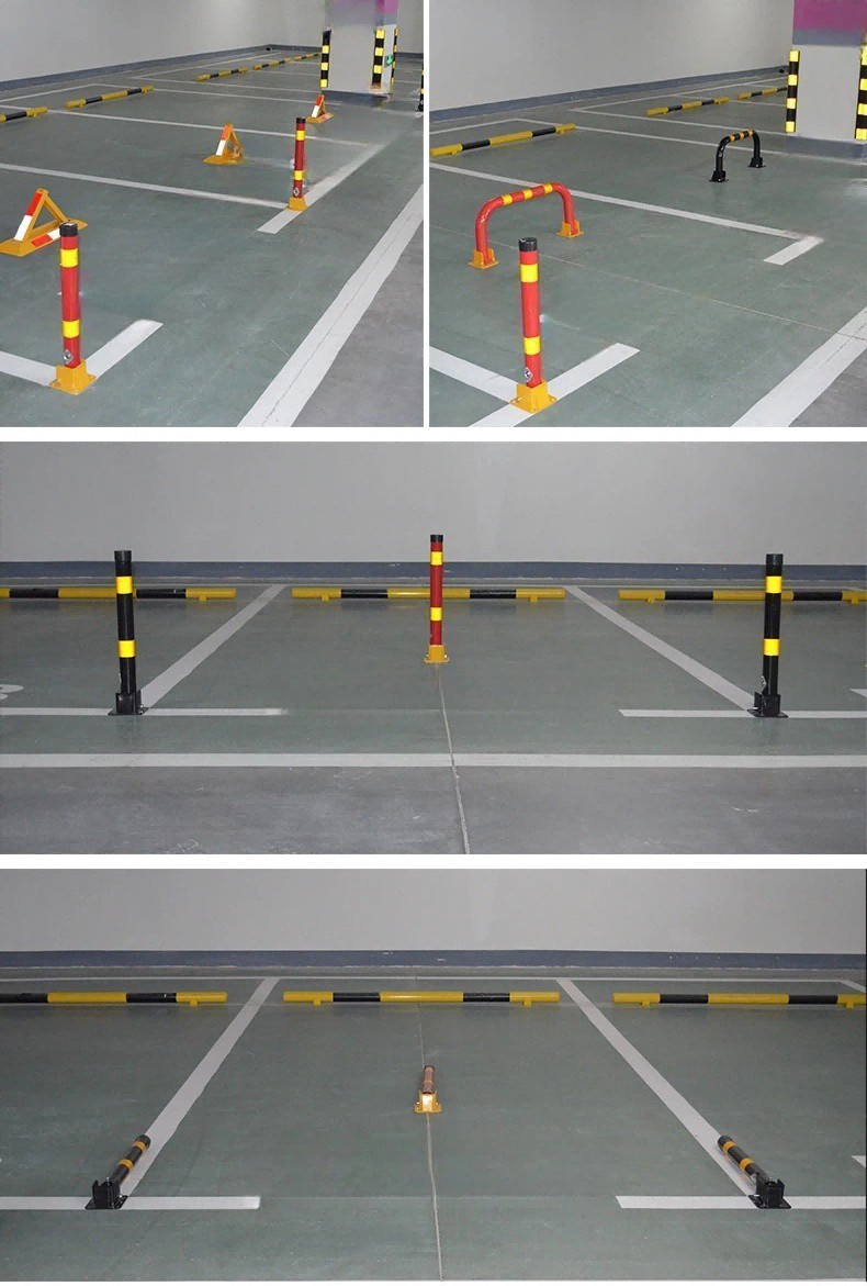 Penghalang parkir pengaman yang dapat dikunci terbuat dari cat semprot suhu tinggi, dan bubuk eksternal dicat merah terang dengan stiker reflektif kuning. Ini sangat reflektif baik siang dan malam.